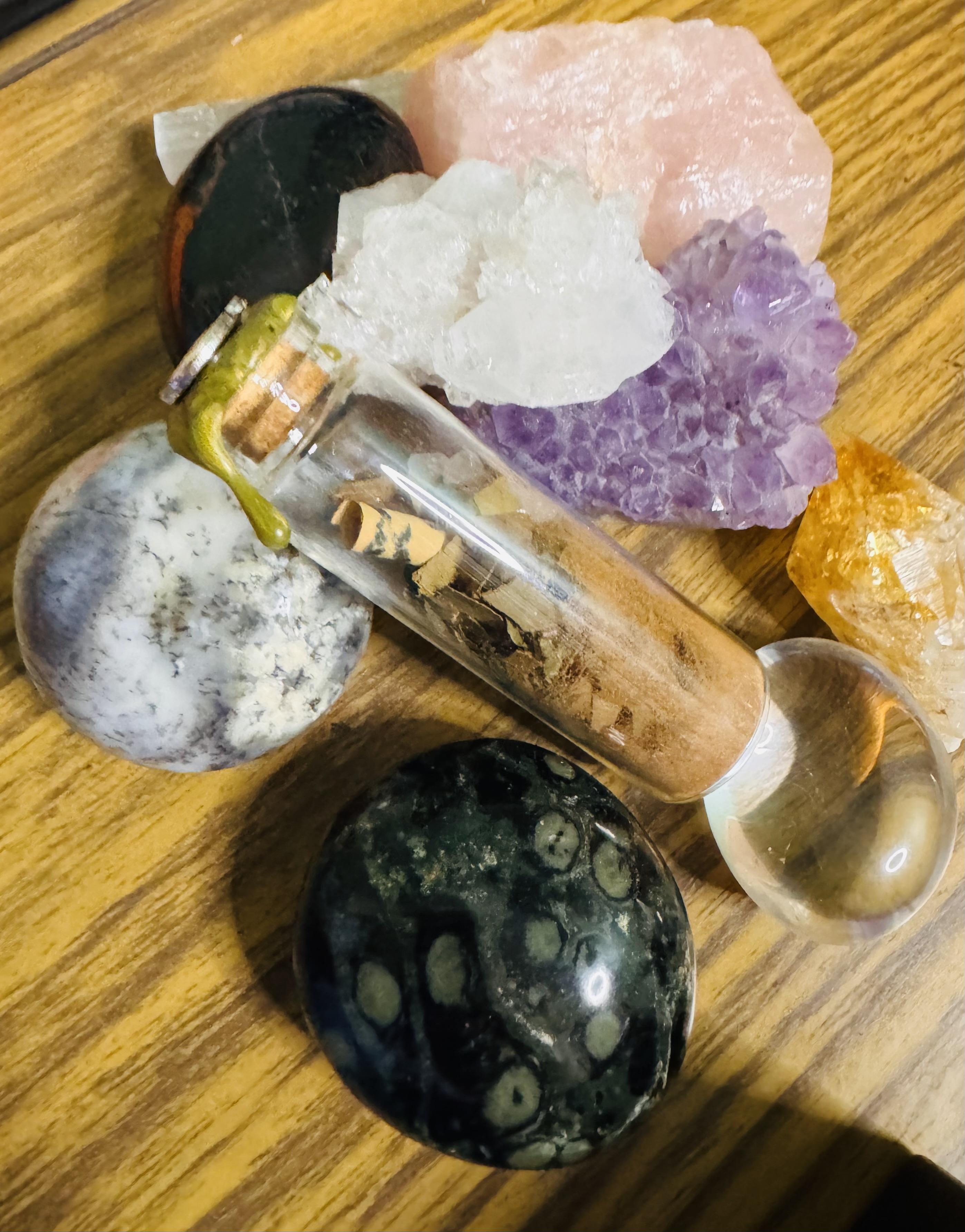 Each glass vial is layered slowly with botanicals selected for their traditional correspondences, crystal chips chosen to stabilise and amplify the focus, and a handwritten scroll placed at the centre of the jar. The talisman is then sealed in wax and gently charged with Reiki before it leaves my hands.